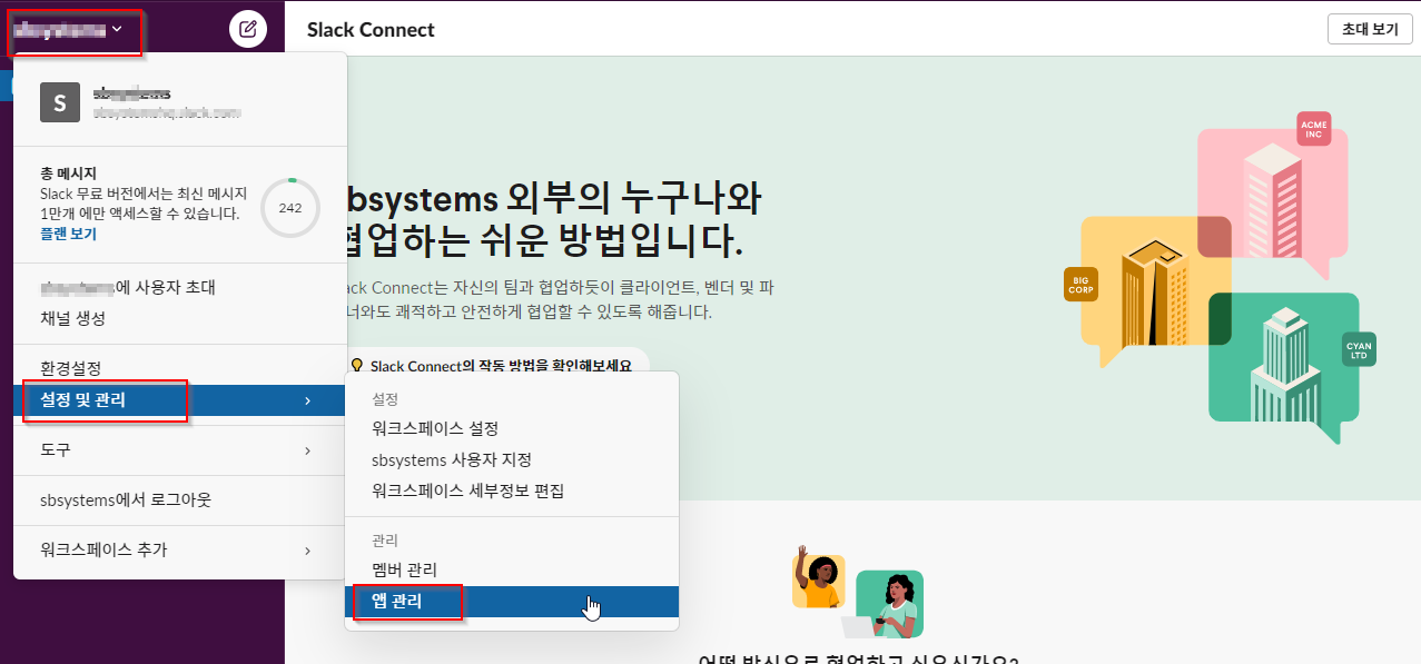 Workspace명은 mycompanyhq.slack.com 에서 앞 sub도메인